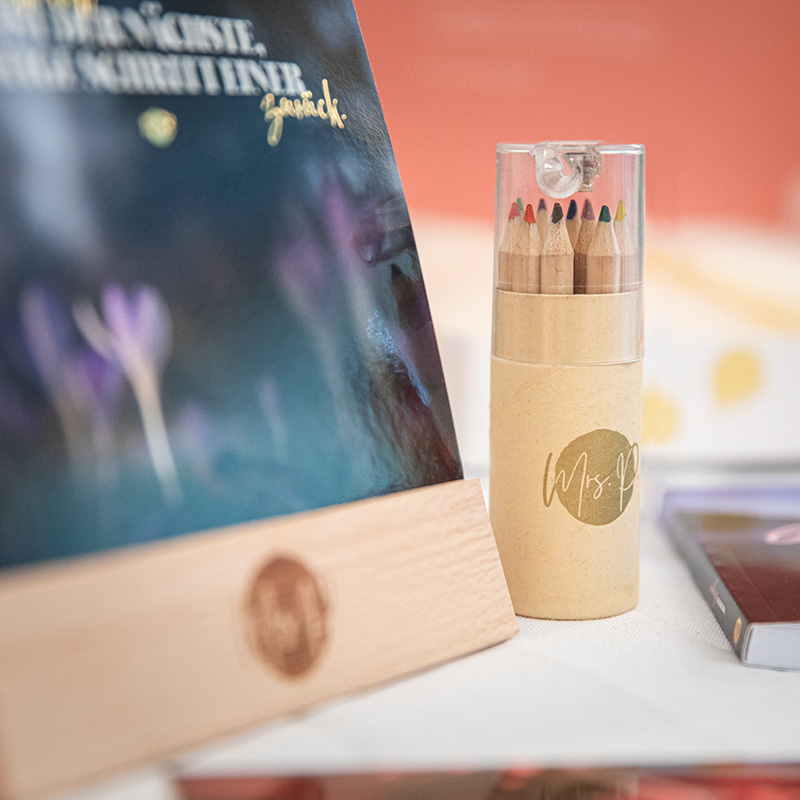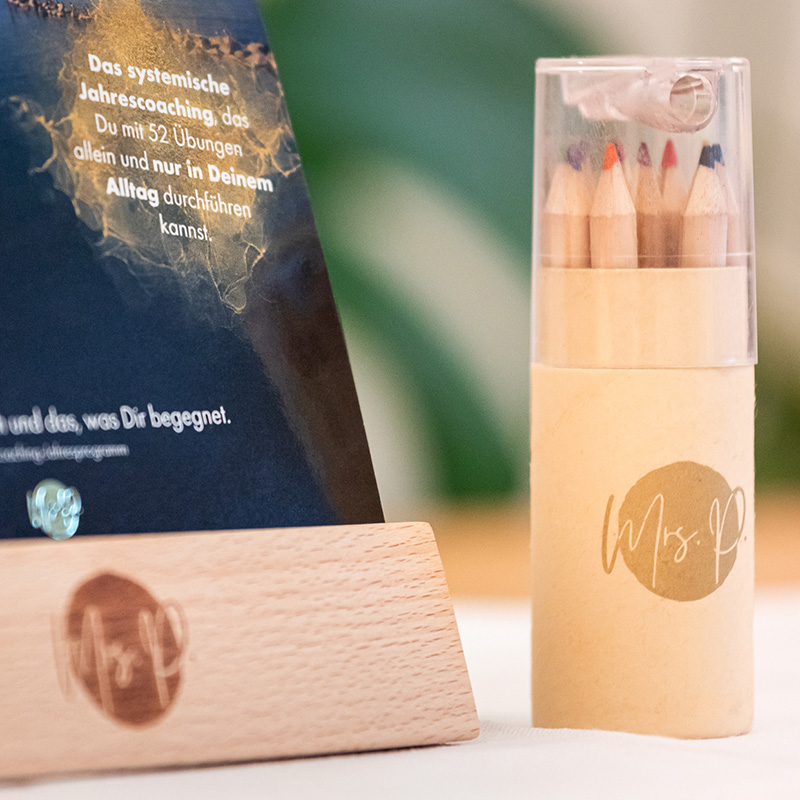 12 Buntstifte und Anspitzer in praktischer Stiftebox mit Deckel zum markieren deiner Emotionen in deinem Workbook.