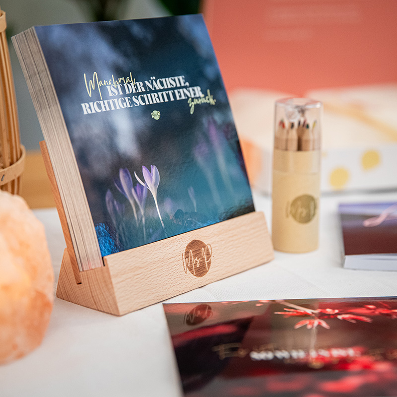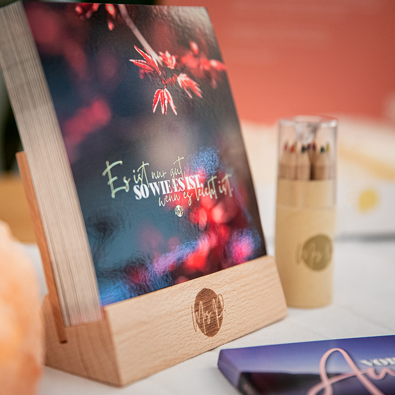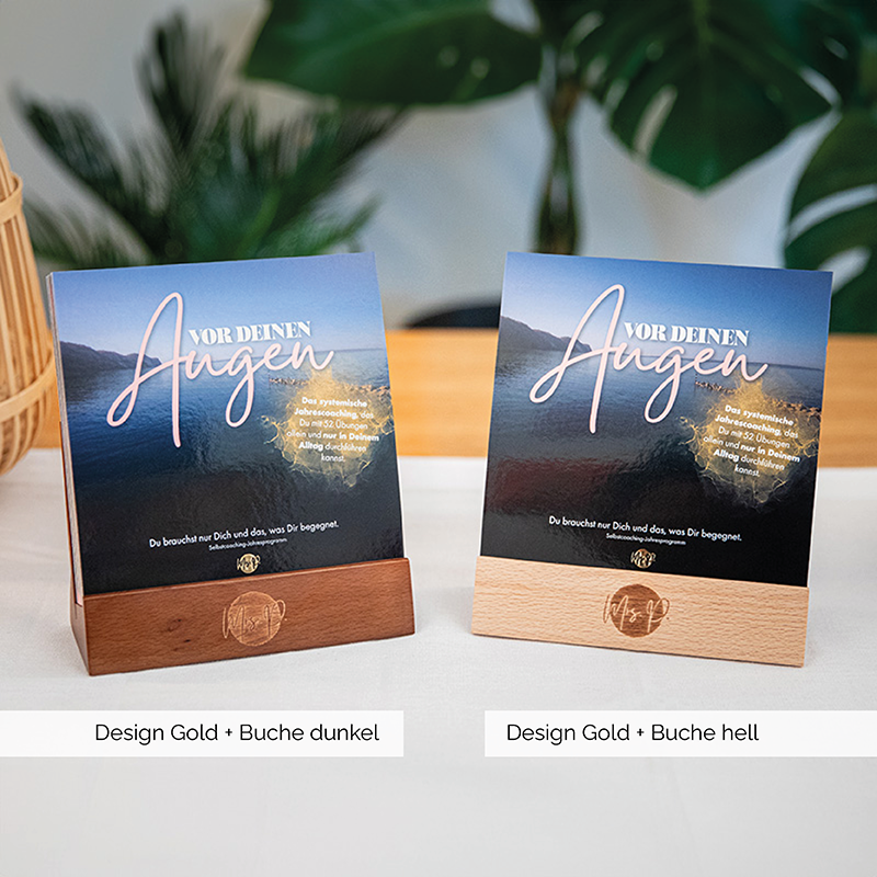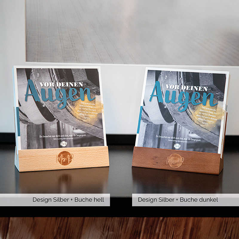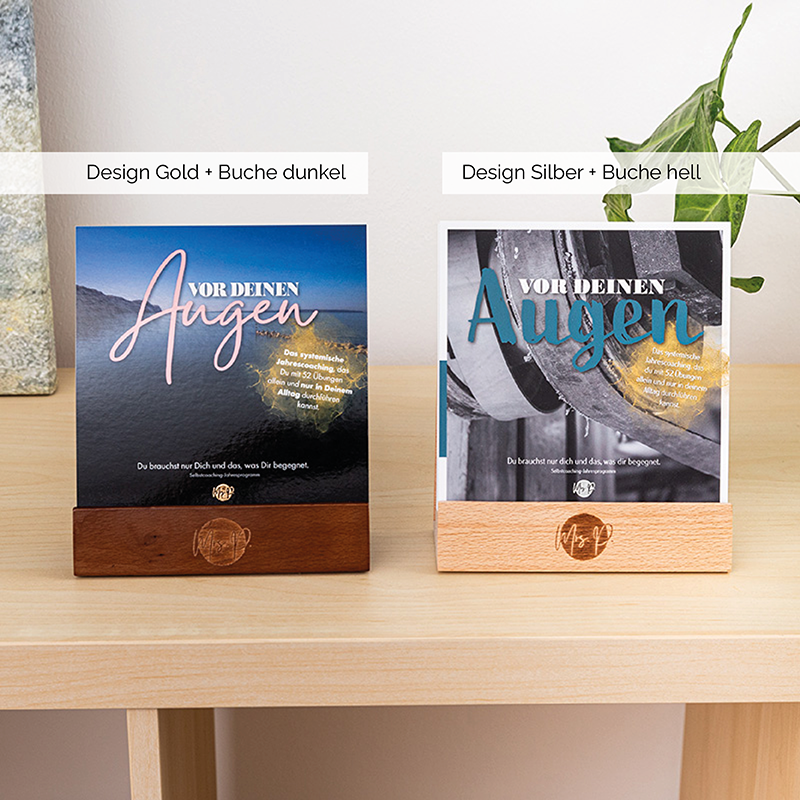 1 hochwertiger Kartenhalter in Buche natur oder dunkel lasiert, jeweils wählbar zu den verschiedenen Designs „gold“ und „silber“.