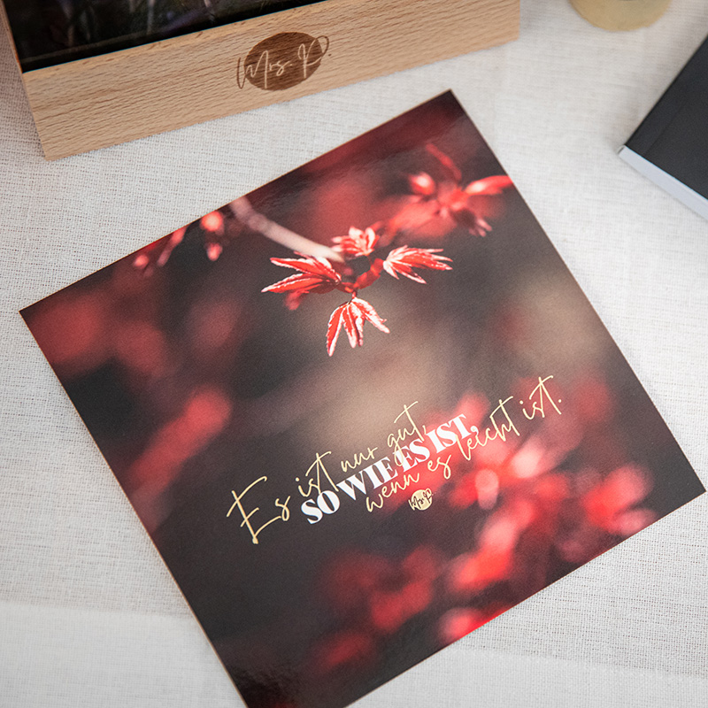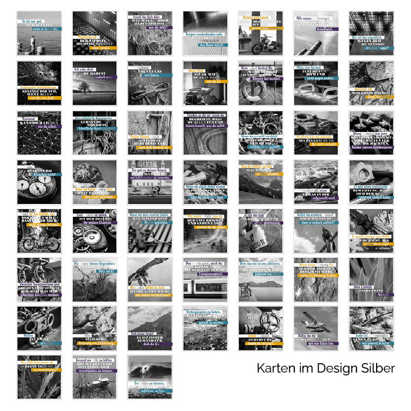 52 dekorative Fotomotivkarten (Format 14,8 x 14,8 cm) mit Zitaten der Autorin und rückseitig jeweils einer dazu passenden, systemischen Übung, einem Praxisbeispiel und den dazugehörigen Hintergrundinfos.