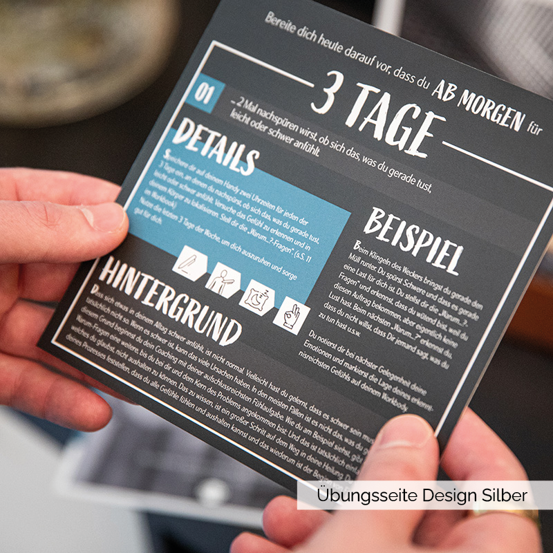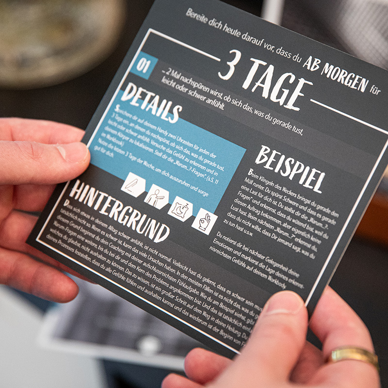 Ich war mir anfangs sicher, dass ich nicht Zielgruppe für „Vor Deinen Augen“ bin. Nach den ersten Karten war ich direkt in meinen Themen und vom Gegenteil überzeugt. Ich habe mich in jeder Übung wiedergefunden. Erschreckend gut.